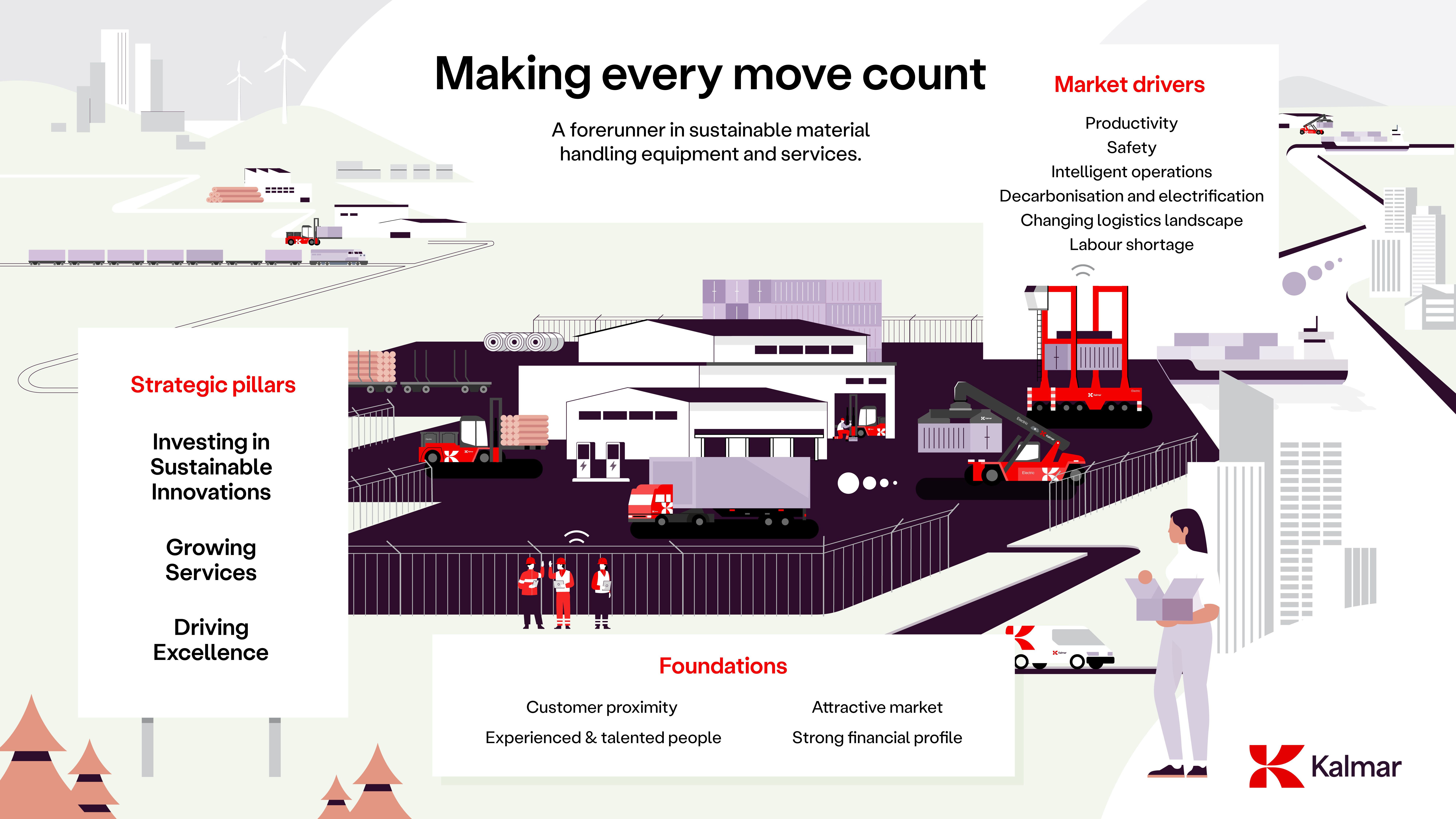 Die Logistikbranche wandelt sich, um den Herausforderungen unserer Welt zu begegnen. Bei Kalmar sind wir an der Spitze dieses Wandels. Mit unserer globalen Reichweite treiben wir den nachhaltigen Materialumschlag voran, schaffen Werte für unsere Aktionäre und helfen unseren Kunden, ihre Sicherheit, Nachhaltigkeit und Produktivität zu verbessern. We're making every move count.