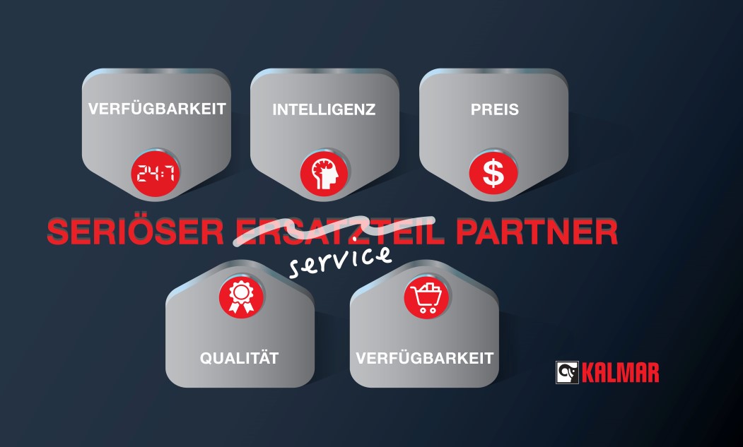 Kalmar ist der Ansicht, dass der Kauf von Teilen kein vollständig reaktiver Prozess sein sollte. Unsere Kunden haben Zugriff auf das Kalmar Pulse-Wartungsplanungskonzept, ein Service, der Daten von angeschlossenen Maschinen verwendet, um die Vorhersehbarkeit des Teileanforderungen zu verbessern und damit die Wartung zu optimieren. Dies stellt sicher, dass der Kunde die richtigen Teile zur richtigen Zeit am richtigen Ort hat. Für den bestmöglichen Kundenbestellprozess steht auch ein leistungsstarker E-Commerce mit allen Geräteinformationen und Ersatzteilenummern der Kunden zur Verfügung. Das Finden der richtigen Teile könnte nicht einfacher sein.
